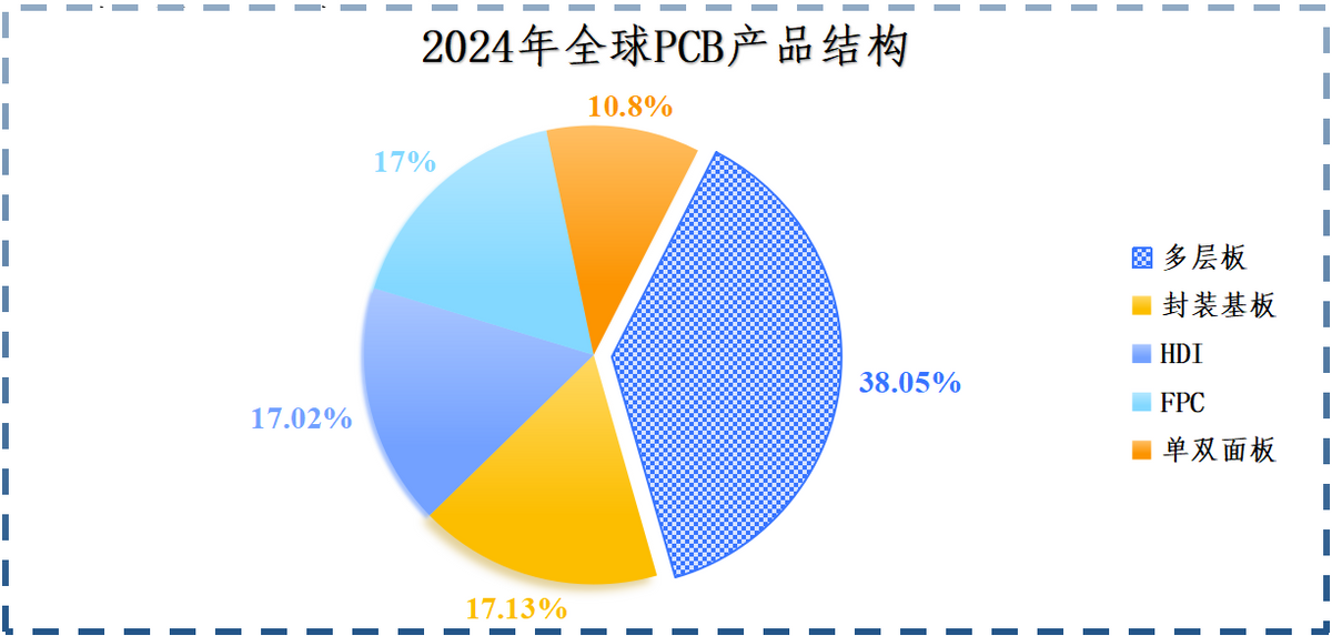 数据显示,2024年全球PCB市场占比最高的种类是多层板,占比高达38.05%,其次是封装基板和HDI,占比分别为17.13%和17.02%。