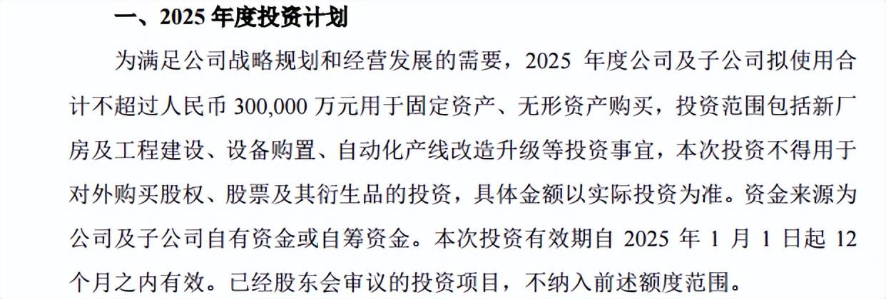 2025年,公司还计划投入30亿元用于固定资产、无形资产以及自动化产线的改造升级等。