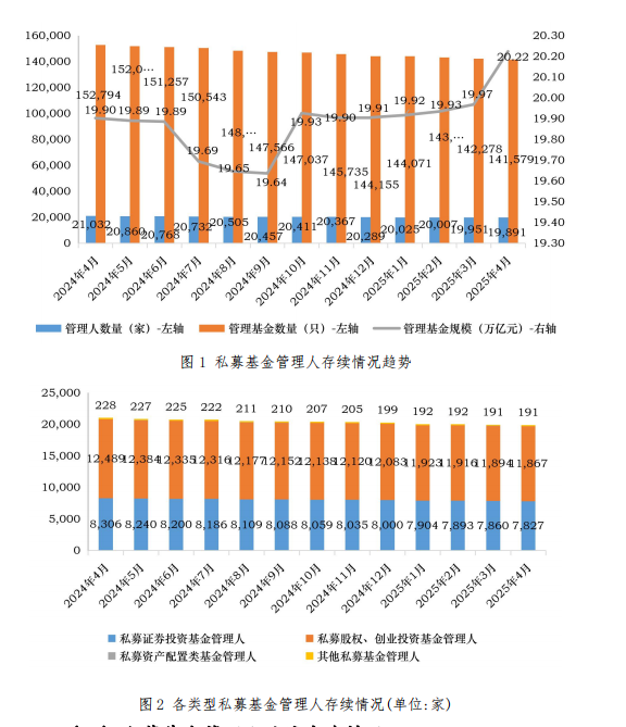 截至4月末,存续私募基金管理人共19891家,管理基金数量为141579只。其中,私募证券投资基金管理人为7827家;私募股权、创业投资基金管理人为11867家;私募资产配置类基金管理人为6家;其他私募投资基金管理人为191家。