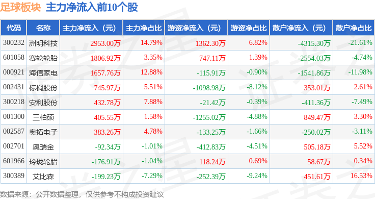 从资金流向上来看,当日足球板块主力资金净流出3.86亿元,游资资金净流出515.16万元,散户资金净流入3.91亿元。足球板块个股资金流向见下表: