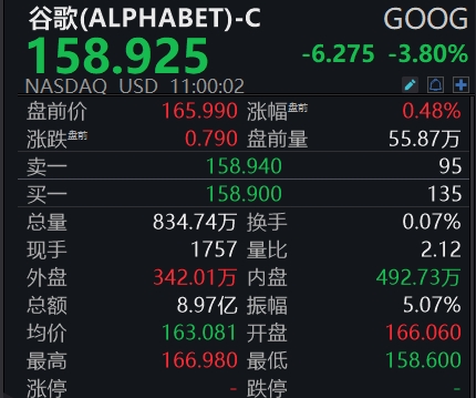 谷歌母公司Alphabet股价跳水,跌幅迅速扩大至超3%。