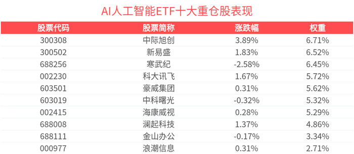 数据显示,截至2025年9月30日,中证人工智能主题指数(930713)前十大权重股分别为新易盛(300502)、中际旭创(300308)、寒武纪(688256)、澜起科技(688008)、中科曙光(603019)、科大讯飞(002230)、豪威集团(603501)、海康威视(002415)、浪潮信息(000977)、金山办公(688111),前十大权重股合计占比61.36%。